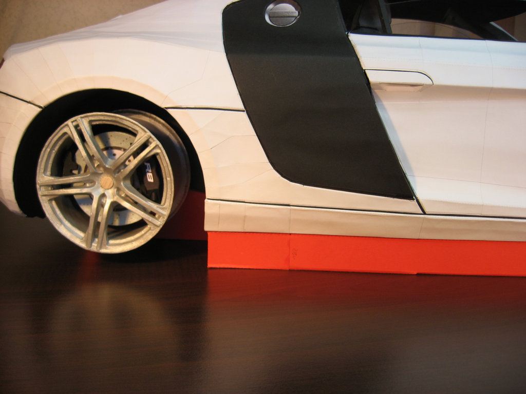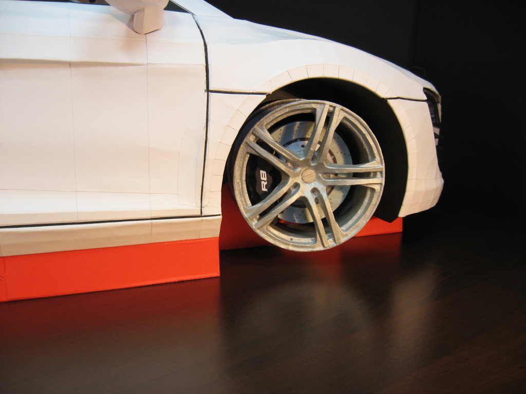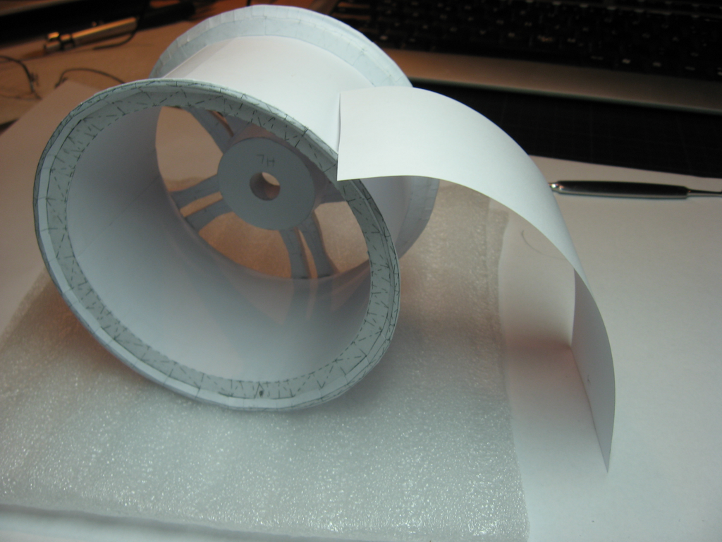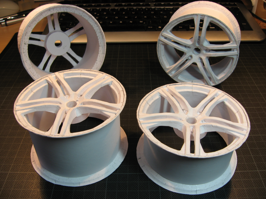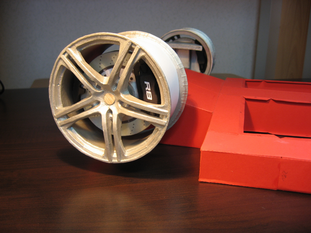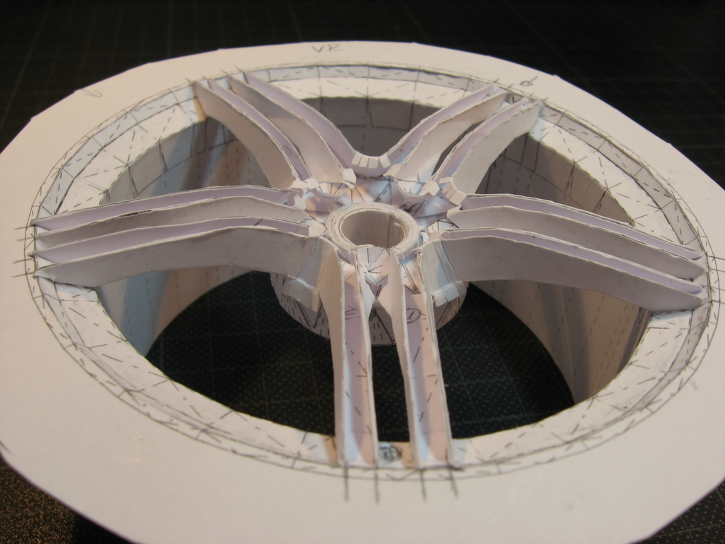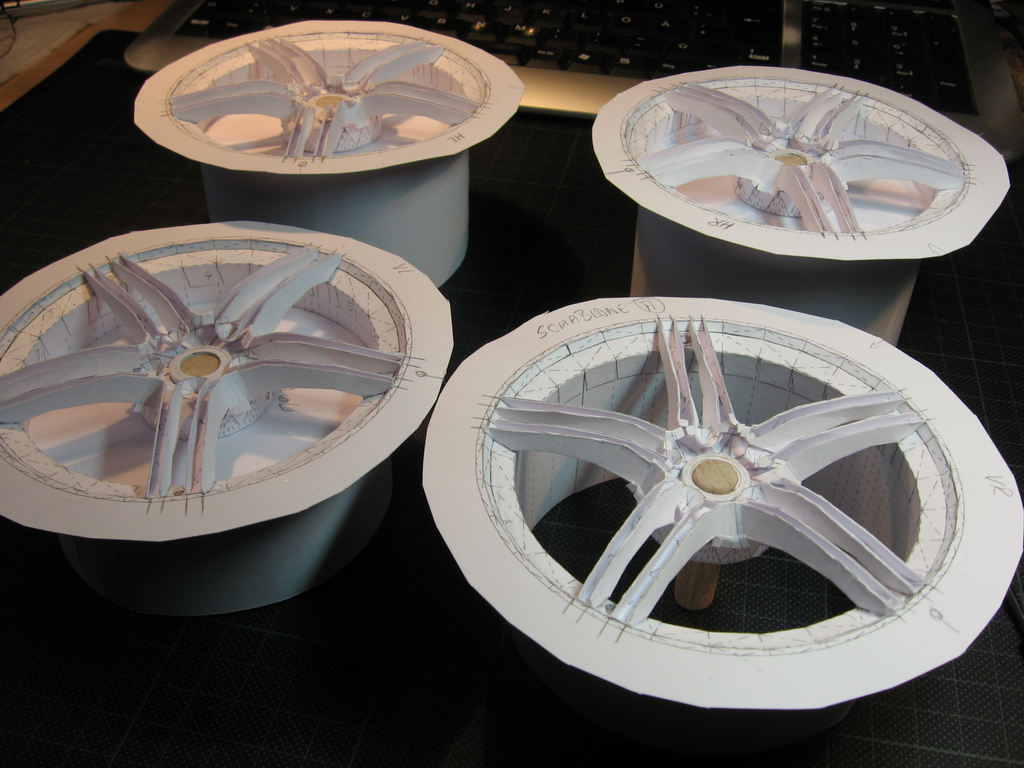 Das kritische Bauteil der Modell-Felge ist die Felgennabe. Im Gegensatz zu einer geschmiedeten Leichtmetallfelge, verfügen wir in diesem Bereich über kein hochverdichtetes Vollmaterial, sondern wollen die Nabe aus Papier und Pappe so gut es geht verwindungssteif verkleben.