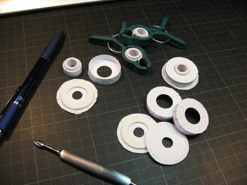 Das Zentrum der Nabe bildet, wie auch bei der Bremsscheibe, ein stabiler Ring aus Tonkarton. An diesem Ring werden die Naben-Bauteile verklebt.