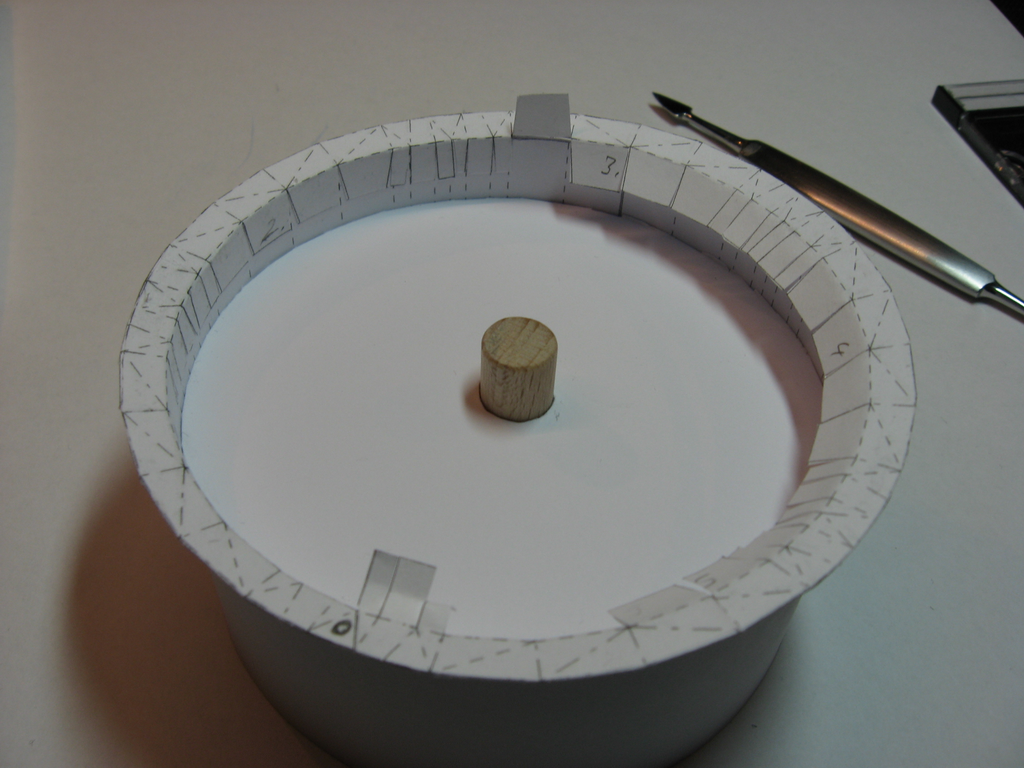 Hier gut zu sehen, die Schablone mit den Dreiecksflächen im Innenkreis.